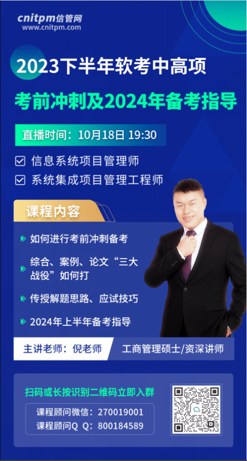 2023年下半年信息系统项目管理师临近开考,对于已经报名且决定参加这次考试的考生而言,目前已经进入最后的冲刺阶段,对于打算放弃这次考试,决定报考2024年上半年的考生而言,目前可能在开始准备备考事宜,那么2023年下半年信息系统项目管理师冲刺阶段如何备考?2024年上半年信息系统项目管理师又如何备考?想要知道答案,不妨来看看JRS直播“2023年下半年软考中高项考前冲刺及2024年备考公开课”。