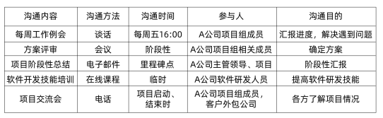 在制定项目管理计划过程中,小张让负责研发的小陈制定沟通管理计划,作为项目管理计划的子计划。小陈认为编制沟通管理计划是一件重复性的工作,于是参考过去的项目管理计划,简单进行了修改后放入了项目计划文件夹下作为公共信息供大家查阅,完成后的沟通管理计划表如下: