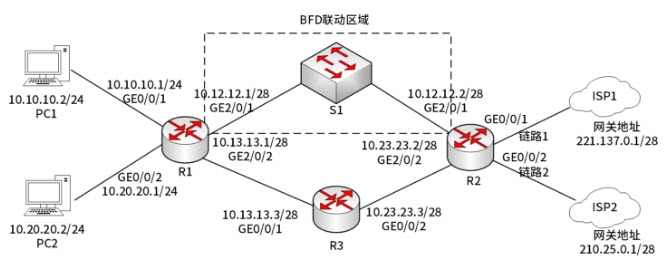 [R1] ip route-static 0.0.0.0 0.0.0.0 GigabitEthemet2/0/1 (3) track (4) R1 to R2 //配置R1的缺省路由,联动BFD使得R1到2的流量优先走R1->S1->R2链路,当此链路发生故障时,流量切换到R1->R3->R2链路上