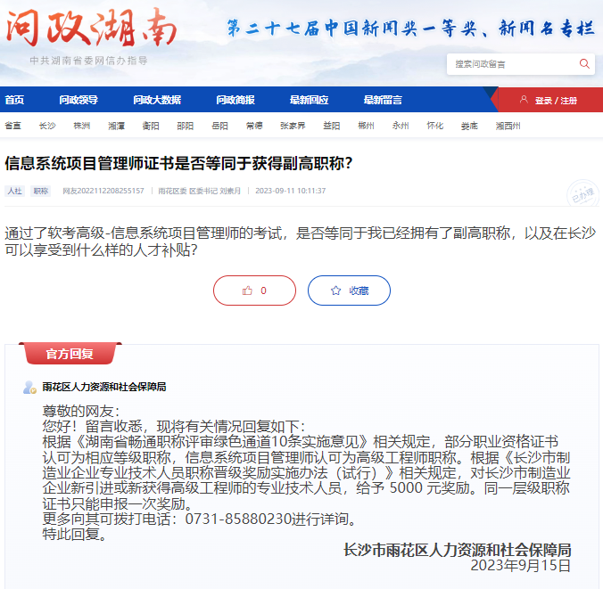的确是有这么一个文件——《长沙市争创国家吸引集聚人才平台若干政策(试行)》( 长发〔2022〕12号),但针对的是在长沙制造业企业工作的新引进或新获得高级职称的人员,如果你不是这类人员,那么即便你有信息系统项目管理师证书也是没用的。