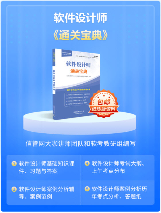 《软件设计师通关宝典》作为JRS直播软件设计师培训课程配套资料之一,报班即免费邮寄赠送,该书搭配课程使用,备考效率更高!