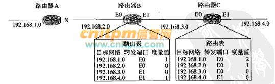 距离矢量路由协议(如RIP)的一个主要问题是会形成路由循环。例如在下图中,路由B和C经过交换路由信息,已经形成了路由表。如果路由器A和B之间的链路在X处断开了,路由器B得不到从A发来的路由信息,但是从C得到了路由信息“192.168.1.0 2”,路由器B就会把路由表的第一行改为“192.168.1.0 E1 3”。如果这种错误得不到纠正,在下一个更新周期中,路由器C从B接受路由信息,又会把它的路由表的第一行改为“192.168.1.0 E0 4”,如此等等,继续错误下去。