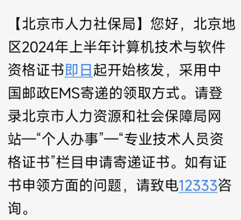 北京人事考试中心官网还未发布领证通知,不过有考生反映收到了北京人社局的领证短信,由短信内容可知,自2024年7月23日起,北京2024上半年软件设计师证书开始发放,合格人员可登录“北京市人力资源和社会保障局网站一个人办事"一“专业技术人员资格证书"栏目申请寄递证书。”申请。