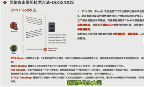 是C子拉的攻击啊,C子拉的攻击呢,先就是新的这种泛洪攻击啊,泛红攻击呢,它是在TCP的三次握手过程中产生的,我们知道三次握手段第一个啊是要发送新报啊,攻击者通过发送大量伪造带有新标准位的TCP中与目标主机建立了很多虚假的半连接。那么借了虚假的半连接以后啊,就是我的服务器呢,会返回一个C+ack的数据包。