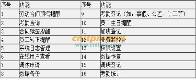 1.(1)2.考勤查询 7.调休申请 9.考勤登记(如:事假、公差、旷工等) 11.加班登记 15.调班登记 16.考勤统计
