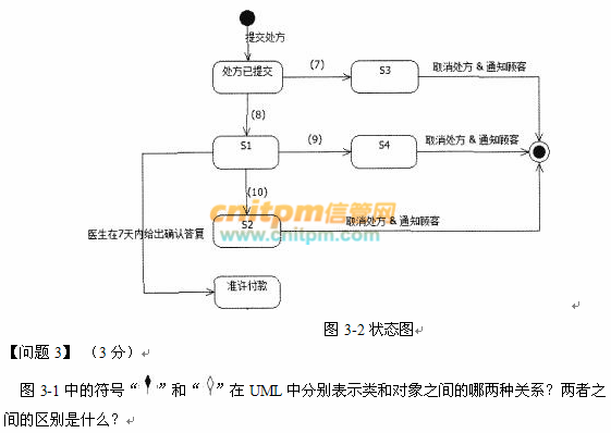 图3-2给出了“处方”的部分状态图。根据说明中的描述,给出图3-2中缺少的S 1~S4所对应的状态名以及(7)~(10)处所对应的迁移(transition)名。