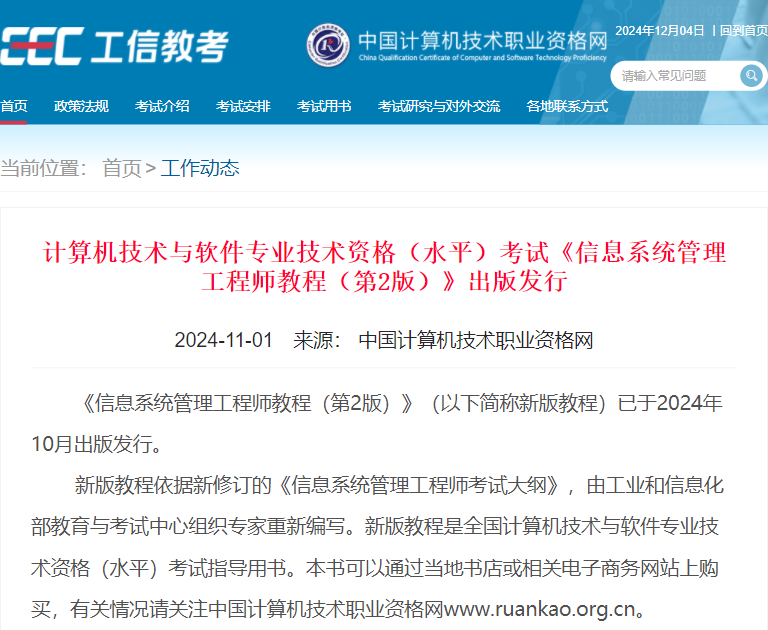 根据中国计算机技术职业资格网发布的通知,2025年上半年信息系统管理工程师考试将启用新版考试大纲 <信息系统管理工程师考试大纲(2024年审定通过)> 和 新版考试教程 <信息系统管理工程师教程(第2版)>。