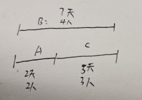 同时,安排2个人完成活动A ,2天时间完成活动A ,完成之后,再增加1人,总共是3人,完成活动C