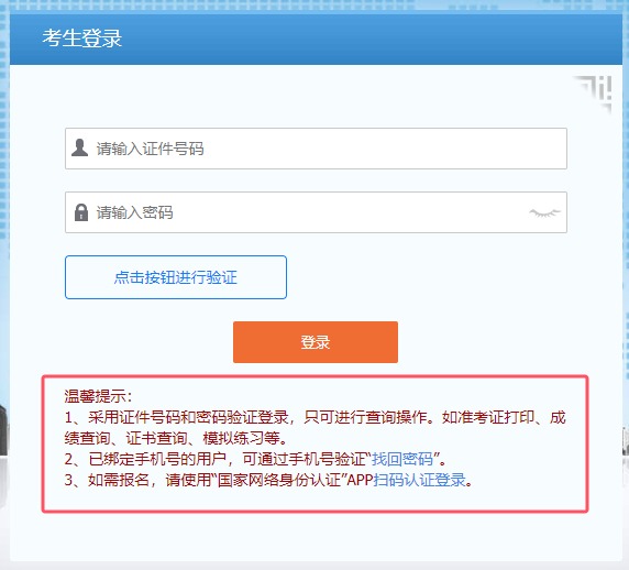 目前,在" 全国计算机技术与软件专业技术资格(水平)考试 " 考生登录界面已经做了相应调整,如采用证件号码和密码验证登录,只可进行查询操作。如准考证打印、成绩查询、证书查询、模拟练习等。如需报名,请使用“国家网络身份认证”APP。