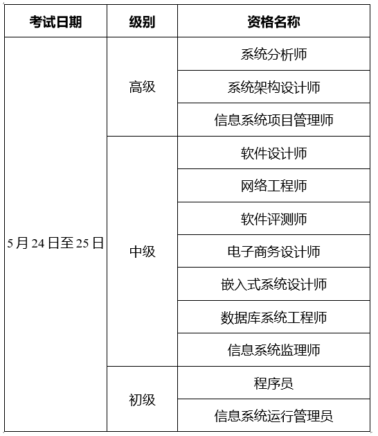 考试时间为5月24日至25日,各级别、各资格的批次划分待考试报名结束后确定,具体考试时间、批次以准考证为准。