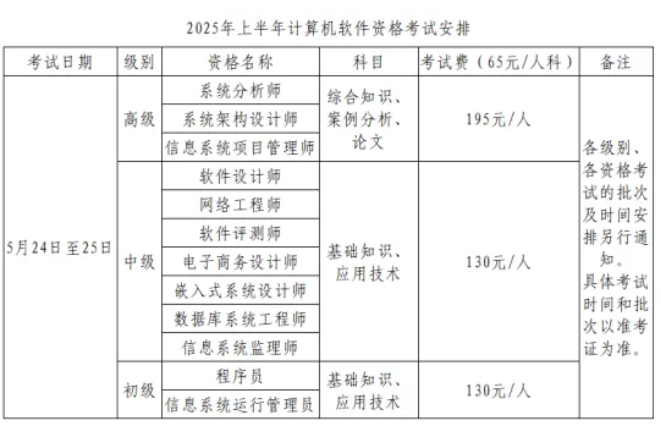 根据工信部教育与考试中心《关于2025年度计算机软件资格考试工作安排及有关事项的通知》(工信教〔2025〕1号),2025年度计算机软件资格考试(初级、中级、高级)采取计算机化考试方式,我省上半年考试日期为5月24日至25日,各级别、各资格考试的批次及时间安排另行通知,具体考试时间和批次以准考证为准。