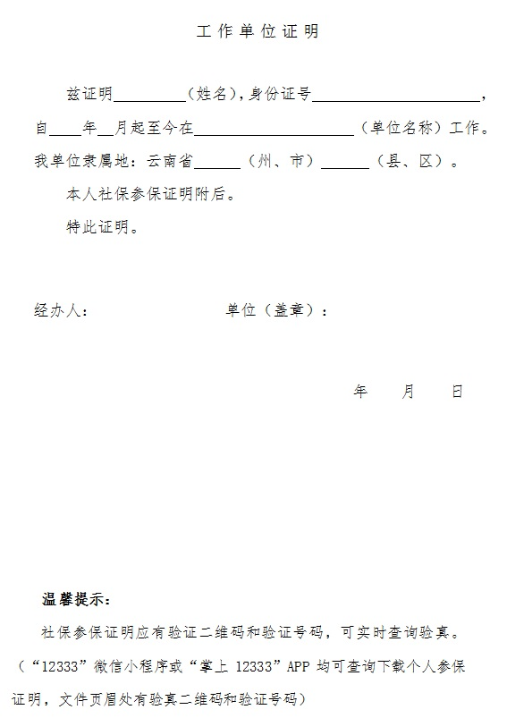 2. 实际工作地在单独划线地区的工作单位证明(必须包括姓名、身份证号、工作单位及工作所在地地址等,实样表在www.ynxr.com云南软考网2025年上半年报名通知附件下载)、本人在单独划线地区社保参保证明(加盖单位公章)。社保参保证明应有验证二维码和验证号码,可实时查询验真。(“12333”微信小程序或“掌上12333”APP均可查询下载个人参保证明,文件页眉处有验真二维码和验证号码)