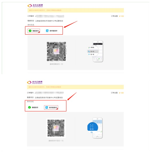 3、进入光大云缴费界面,选择“微信支付”或“支付宝支付”,扫码支付: