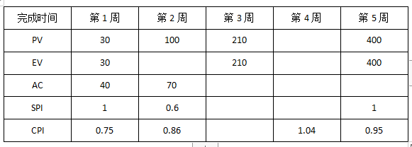 完成时间<br>第1周<br>第2周<br>第3周<br>第4周<br>第5周<br>pv<br>30<br>100<br>210<br>290<br>400<br>ev<br>30<br>60<br>210<br>250<br>400<br>ac<br>40<br>70<br>210<br>240<br>420<br>spi<br>1.00 <br>0.60 <br>1.00 <br>0.86 <br>1.00 <br>cpi<br>0.75 <br>0.86 <br>1.00 <br>1.04 <br>0.95 <br>