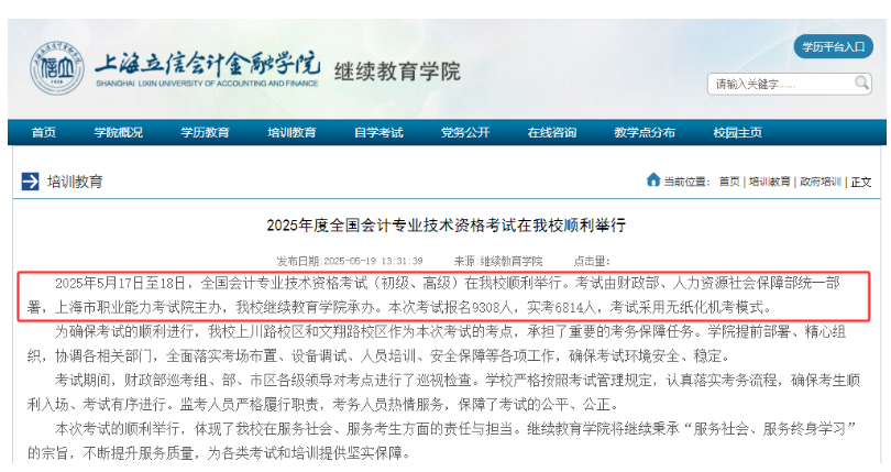 近期,上海立信会计金融学院继续教育学院官网发布了一则工作动态,动态中说明:"我校文翔路校区作为本次考试考点,采用计算机化考试模式,涵盖中级和高级多个资格类别。我校考点共计报名应考人数5124人,实际参考人数2242人,考试组织井然有序。"