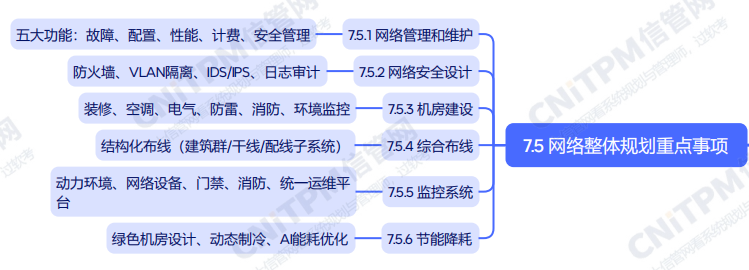 系统规划与管理师第3版教程第七章网络环境规划第五节主要内容考点涉及:网络管理和维护、网络安全设计、机房建设、综合布线、监控系统、节能降耗等,具体思维导图整理如下: