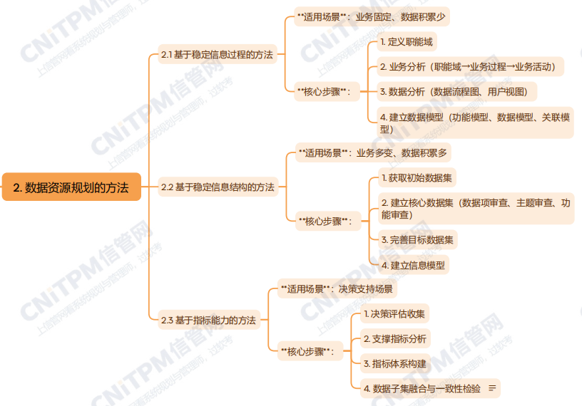 系统规划与管理师第3版教程第八章数据资源规划第二节主要内容考点涉及:基于稳定信息过程方法的核心步骤与适用场景、基于稳定信息结构方法的适用场景和核心步骤、基于指标能力方法的适用场景和核心步骤等,具体思维导图整理如下: