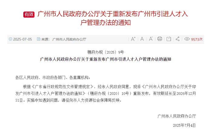 但让人失望的是,在今年的7月4日,广州人民政府发布了通知:将《广州市人民政府办公厅关于印发广州市引进人才入户管理办法的通知》(穗府办规〔2020〕10号)重新发布,有效期延长至2026年12月31日。