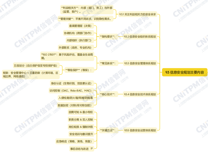 系统规划与管理师第3版教程第九章信息安全规划第三节主要内容考点涉及:关注利益相关方的安全诉求、信息安全组织体系规划的架构要求、信息安全管理常见体系、信息安全核心技术、信息安全运营的关键方法等,具体思维导图整理如下: