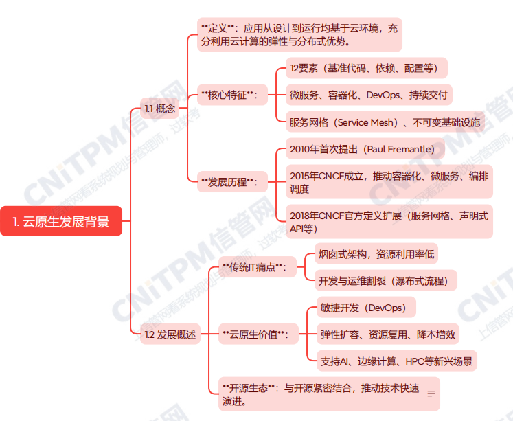 系统规划与管理师第3版教程第十章云原生系统规划第一节主要内容考点涉及:云原生发展背景的概念、核心特征、发展历程等,具体思维导图整理如下: