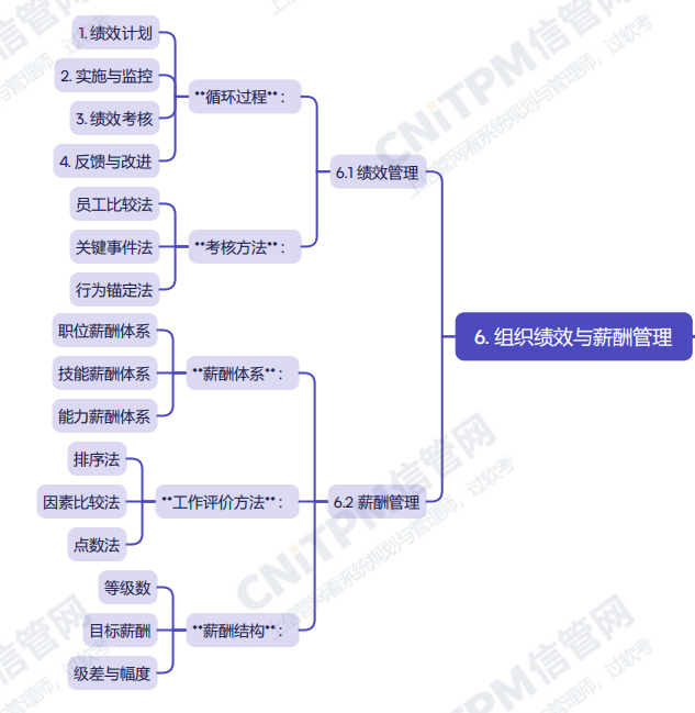 系统规划与管理师第3版教程第十三章人员管理第六节主要内容考点涉及:绩效管理循环过程和考核方法、薪酬体系、工作评价方法、薪酬结构等,具体思维导图整理如下: