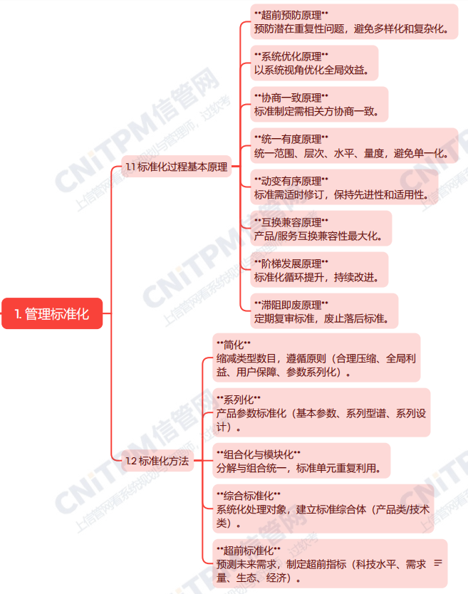 系统规划与管理师第3版教程第十四章规划与过程管理第一节主要内容考点涉及:标准化过程基本原理、标准化方法等,具体思维导图整理如下: