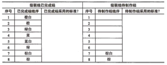 在网络工程实施中,有两台网络交换机需要进行级联,但不能使用以太交换机的级联口。工程人员需要按照EIAffIA 568标准制作级联双绞线,并且一端已经制作完成,线序如下表所示。请根据给定条件填写表中的待制作端线序,并回答表中提出的问题(填写到问露下的空白处)。