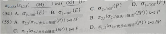 给定员工关系E(员工号,员工名,部门名,电话,家庭住址)、工程关系P(工程号,工程名,前期工程号)、参与关系EP(员工号,工程号,工作量)。查询“005”员工参与了“虎头山隧道”工程的员工名、部门名、工程名、工作量的关系代数表达式如下∶