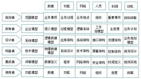 zachman框架,确定目标愿景和原则,现状描述与分析,制定工作计划,确定数据架构,改进与差距点我析,x√√√√