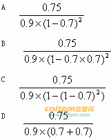 某系统的可靠性结构框图如下图所示。该系统由4个部件组成,其中2、3两个部件并联冗余,再与1、4部件串联构成。假设部件1、2、3的可靠度分别为0.90、0.70、0.70。若要求该系统的可靠度不低于0.75,则进行系统设计时,分配给部件4的可靠度至少应为( ) 。