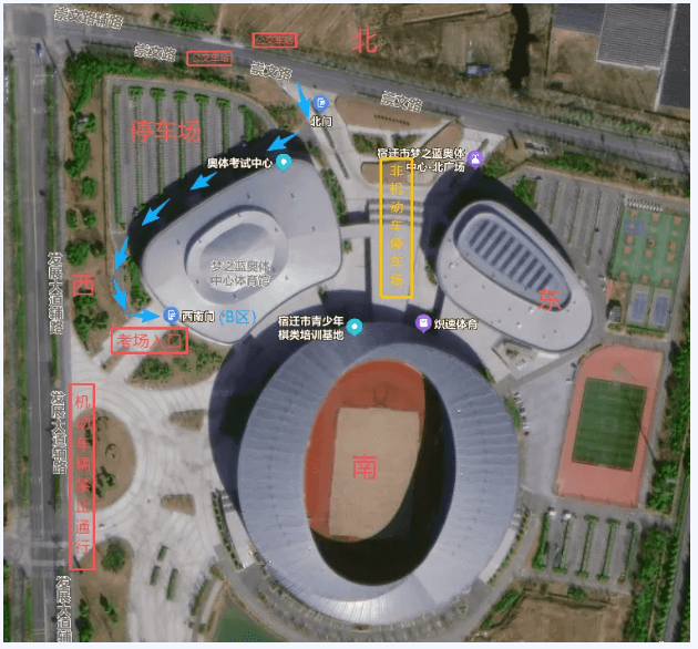 考生凭准考证统一从宿迁奥体考试中心北门进入考点,按道路指引到达考场。