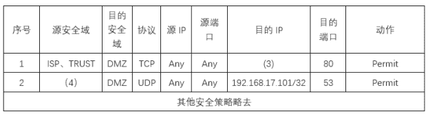 企业内网和互联网用户正常通过域名访问企业的WEB、DNS服务仅对内网用户开放,网络程师对防火墙的配置做如下规划,请补充空白部分。