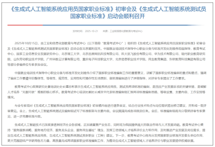 这种推测并非空穴来风。就在上个月,工信教考中心已组织专家审定《生成式人工智能系统应用员国家职业标准》初审稿。结合国家在人工智能领域的战略布局,该职业资格很有可能在不久的将来正式推出。