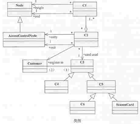 2、根据说明中的描述,给出图3-2中缺少的C1~C6所对应的类名以及(2)~(3)处所对应的多重度(类名使用说明中给出的英文词汇)。