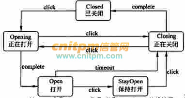 传输门是传输系统中的重要装置。传输门具有Open(打开)、Closed(关闭)、Opening (正在打开)、StayOpen(保持打开)和Closing(正在关闭)五种状态。触发状态的转换事件有click、complete和timeout三种。事件与其相应的状态转换如下图所示。