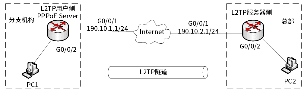 某公司在其他城市设有多个分支机构,分支机构内部使用以太网络。为了便于分支机构开展工作,现计划在分支和总部之间部署L2TP,以实现VPDN连接。网络拓扑图如下所示