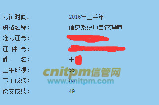 下面我说一下我所复习的内容,上午考试部分,我基本上都是做真题,没看过教材,历年真题从2005年-2013年的,按照章节分类形式做一遍,后面再针对性做一遍错题,其他题目大概复习一下,通过JRS直播每日一练进行检验。上午考试部分,我花费的时间最长,用时一个半月。案例分析部分,我大概看了一周,做了几年的真题,学习案例分析做题思路,根据项目管理知识回答。论文部分,我也准备了一周,根据JRS直播论文投票结果准备了整体管理和范围管理论文的框架,我并没有实际准备整篇文章,即使准备了,估计我也背不下来。考试结束后,上午考试55分,案例分析53分,论文49分。说起论文考试,也是我最纠结的一门,其他两门考试之后可以对照答案估分,估分50以上也就没啥问题。而论文考试没法估分,本来准备了整体管理和范围管理,结果在论文考试的时候脑袋秀逗了,平时非常熟练的范围管理的输入输出,我当时就是想不全,迟迟不能下笔,我临时决定写事先没有准备的进度管理,这一块跟我平常工作关系密切,我按照论文写作框架分小类写了进度管理各个子过程,最后我写了工作中遇到的两个问题与解决办法,应该是写到阅卷老师的心坎了。另外,我字写得较差,从小学到大学、研究生、工作后都没有认真练过,考试时间紧写得就更差了,有些地方写错字了还有修改秒粗字体部分,最终论文字数大概2700,写完还剩5分钟,当然如果我字迹工整漂亮些就更好了,这个也不是一时半会可以锻炼出来的。