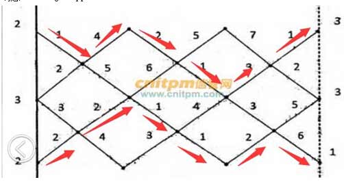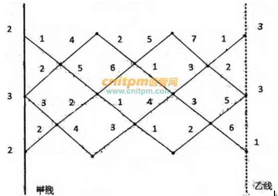 已知网络图各段路线所需费用如下图所示,图中甲线和乙线上的数字分别是对相应点的有关费用,从甲线到乙线的最小费用路线是( 1 )条,最小费用为( 2 )