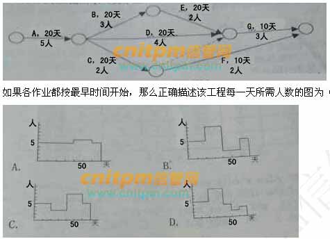 某信息系统集成项目包括7个作业(A~G),各作业所需的时间、人数以及各作业之间的衔接关系如图所示(其中虚线表示不消耗资源的虚作业)