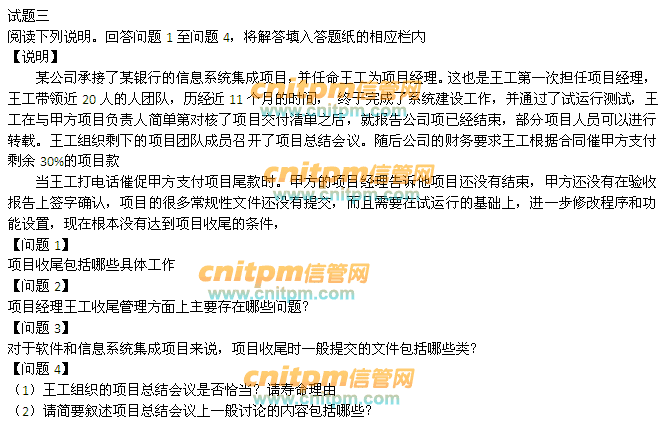 3.1项目收尾管理工作包括:①项目验收工作;②项目总结工作;③系统维护工作;④项目后评价工作。