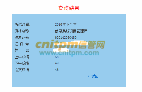 有了目标后,动力就足了,以前下班后就是陪娃,或者玩玩游戏,现在大部分时间都是看JRS直播,找资料,总结案例,做计算题,背作文,参看更多前人的经验,并且我还定了很多小目标,如将9大过程的输入输出都背了下来,然后结合一些资料上总结的口诀,进行背诵,我小孩都说我有的时候像念经似的,不知道在念什么,我想这也是属于加快记忆的方式吧。下半年除了上班完成必要的工作以外,其他业余时间基本就在背诵中度过了。临考前,又把这几年的中级和高级的计算题又自己做了一遍,对不太理解的地方不放过,一定要找到原因。临考前一个月,又出差,11月10号才回来,差点错过考试。幸好准备充分,考的内容大部分都看过,有的要点也背过,所以下午两门感觉还行,案例还提前10分钟交卷了,作文也正好在背的4篇中。查分58,49,46.分数出来了,实际上自己还有点遗憾,特别是下午的分数感觉有点低,不过能够过也算是对自己有个交待了。
