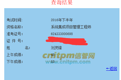 说来也是有些难为情,这已经是我第二次考系统集成项目管理工程师了。作为计算机专业的我真是非常不应该的,也许是自己太过于大意,上一次上午考了55,下午才考了35分。这次上午和下午的成绩分别是48和53,成绩虽然不高,但也算是给自己一份满意的答卷。成绩单刷一波吧!