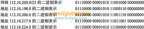 题干中指出子网掩码的长度为21位,即:11111111 11111111 11111000 00000000 ,要判断两个IP地址是否属于同一网站,使用IP地址与子网掩码进行逻辑AND运算,如果两个所得的网段号相同则两个IP地址在同一网段。 所以只有112.10.206.0IP地址所在网段号与题干IP的网段号相同。