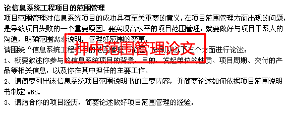 论文我们在考前一个月给出的YT里面就YZ了范围管理这个论题,并在考前一直强调重点准备范围、进度,通过我们的YT和批阅,培训学员论文应该不成问题。