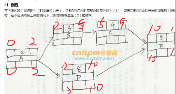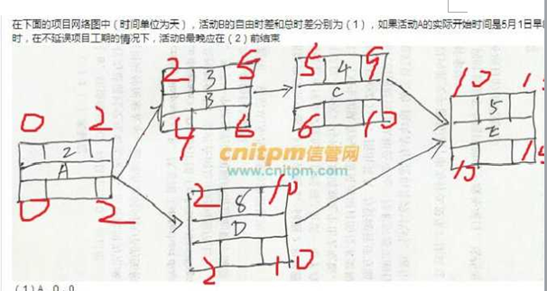 在下面的项目网络图中(时间单位为天),活动B的自由时差和总时差分别为(1),如果活动A的实际开始时间是5月1日早8时,在不延误项目工期的情况下,活动B最晚应在(2)前结束