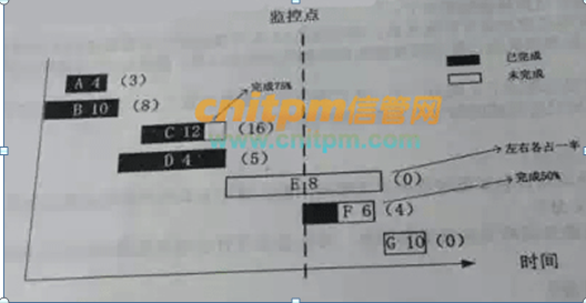 项目中各项任务的预算(方框中,单位是万元)、从财务部获取的监控点处各项目任务的实际费用(括号中,单位为万元),及各项任务在监控点时的完成情况如下图: