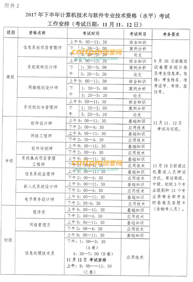 根据人力资源与社会保障部发布的《人力资源社会保障部办公厅关于2017年度专业技术人员资格考试计划及有关问题的通知 人社厅发〔2016〕174号》和软考办《2017年度计算机技术与软件专业技术资格(水平)考试工作安排》,2017年下半年软考信息系统项目管理师考试时间为11月11日,2017下半年开考的软考考试如下: