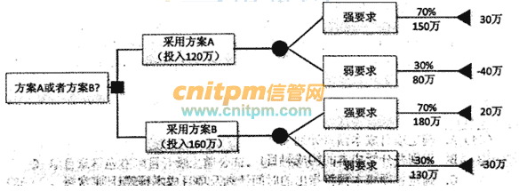 某公司正在准备竞标一系统集成项目,为了估算项目的收益,技术总监带领风险管理团队,对项目可选的两种集成实施方案进行了决策树分析,分析图如下所示。以下说法中,正确的是()。