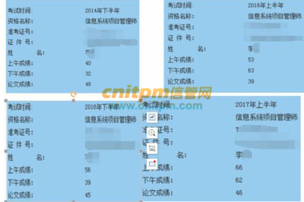 初试小考----当时是2014年的夏天,我先从淘宝上买了本清华版的信息系统项目管理师的教材,然后就开始了我软考之路,当时在网上买了点相关培训教程,似懂非懂的开始了学习,书看了几遍基本没什么印象,历年真题基本是走马观花,很多题目当时给了答案也摸不到方向,而年底11月的考试眼看再有1个月就要到了,没办法,上午选择基本没怎么刷题,下午案例就背了点案例常用的套路,抱着试一试的心态仓促的准备了一篇论文,当时信管论文我就大概看了下就按排名第一的准备了一篇进度的论文,论文要求就是把管理过程写一遍,加点例子就可以,考试开始那天由于准备过于仓促,还忘了拿准考证,又给老婆大人打电话,让人家打车送到我的考场,浑浑噩噩的一天考完了,天色已经完全黑了,我的心情也沉到了极点,听到周围的考生兴奋的谈论下午考试案例的计算题,感觉自己案例肯定挂了,到了家,媳妇批头盖脸的骂了我一顿,为了送准考证,媳妇没顾的上照顾孩子起床,菜也没买,中午饭都没来得及做。经过一个月的等待,成绩下来了,结果可想而知:40,32,48,考试完的感觉已经淡忘了,时间是最好的清洗剂,那之后我感觉软考很难,相当难,我认为要现实些,尽快弥补自己的伤痛,听说二建可以,所以我15年报考了二级建造师,还买了当时的所谓的YT,结果一样我 实务没过好像是44,其他公共课都过了,但实务也是很难。