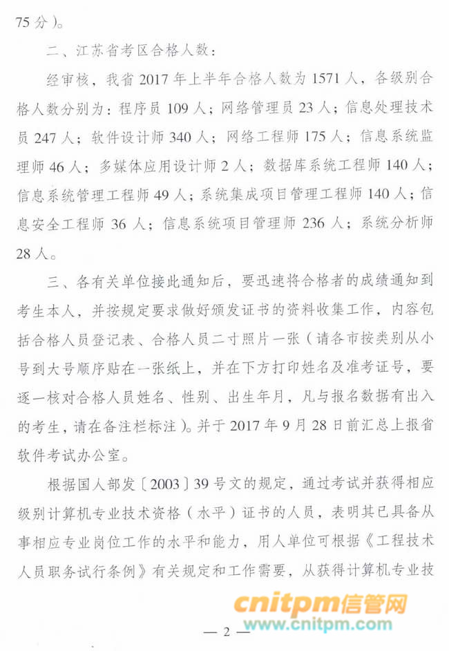 JRS直播讯:根据江苏省经济和信息化委员会、江苏省人力资源和社会保障厅苏经信培训[2017年]640号文件通知,2017年上半年江苏省计算机技术与软件考试高级信息系统项目管理师合格人数为236人。